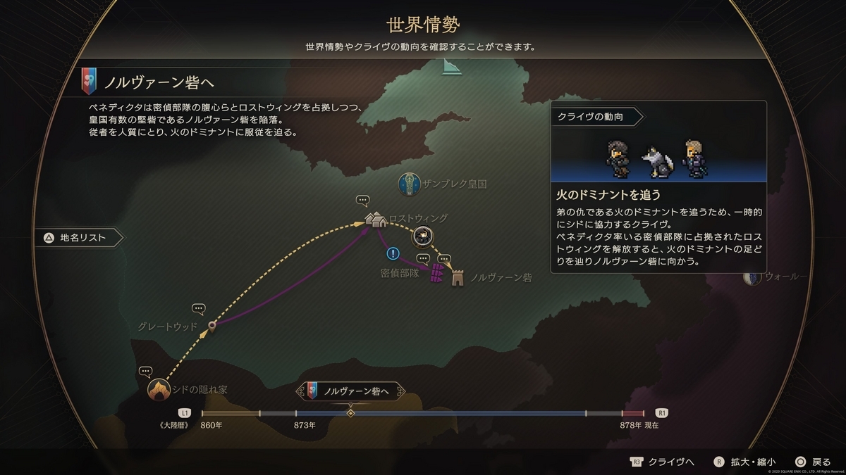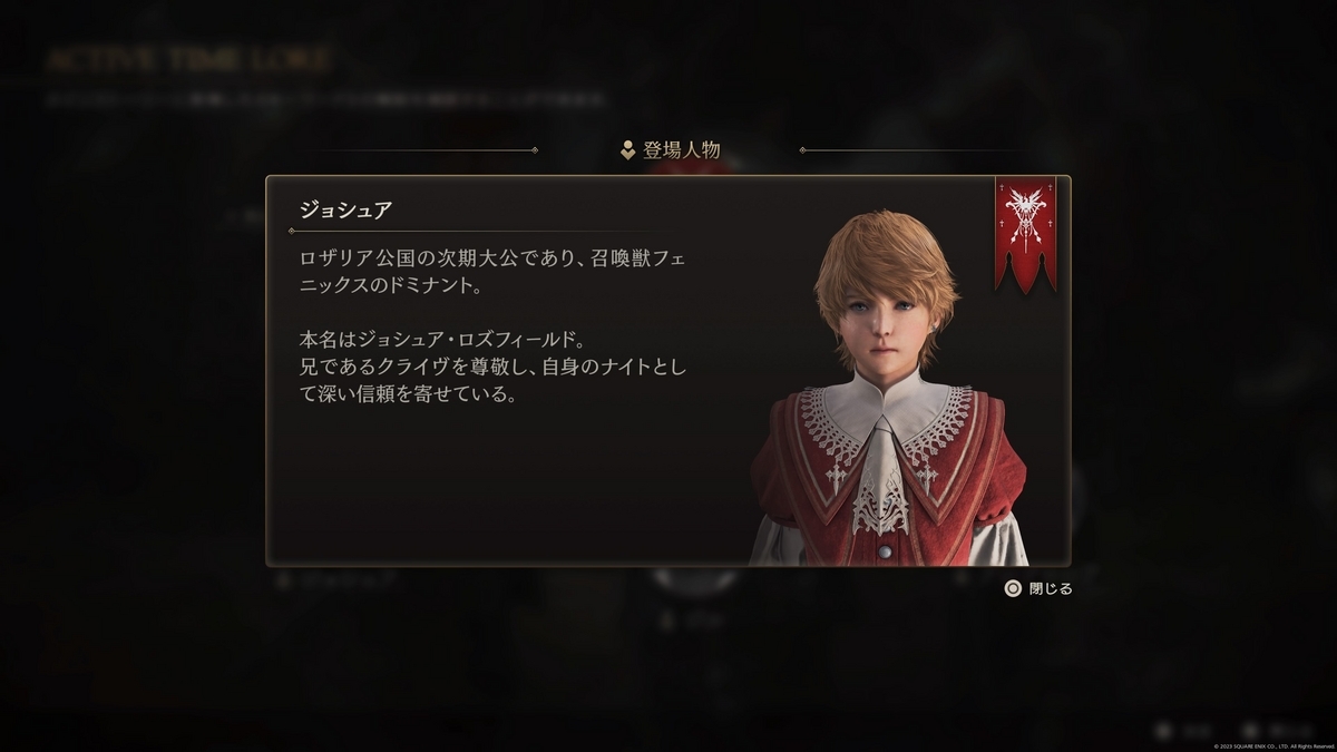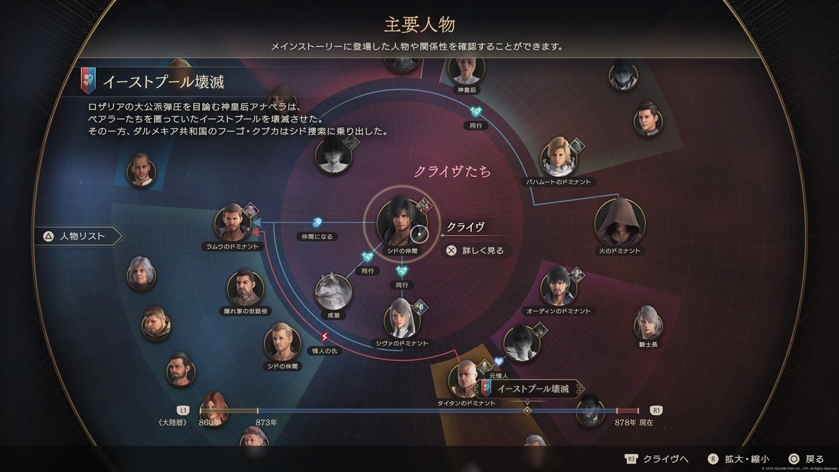 ストーリーでは進行別の人物の簡潔な説明や人間関係、世界情勢を確認できる。