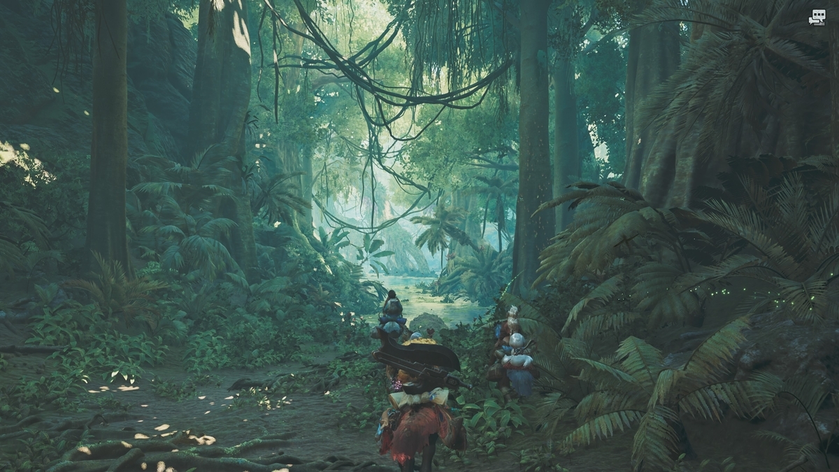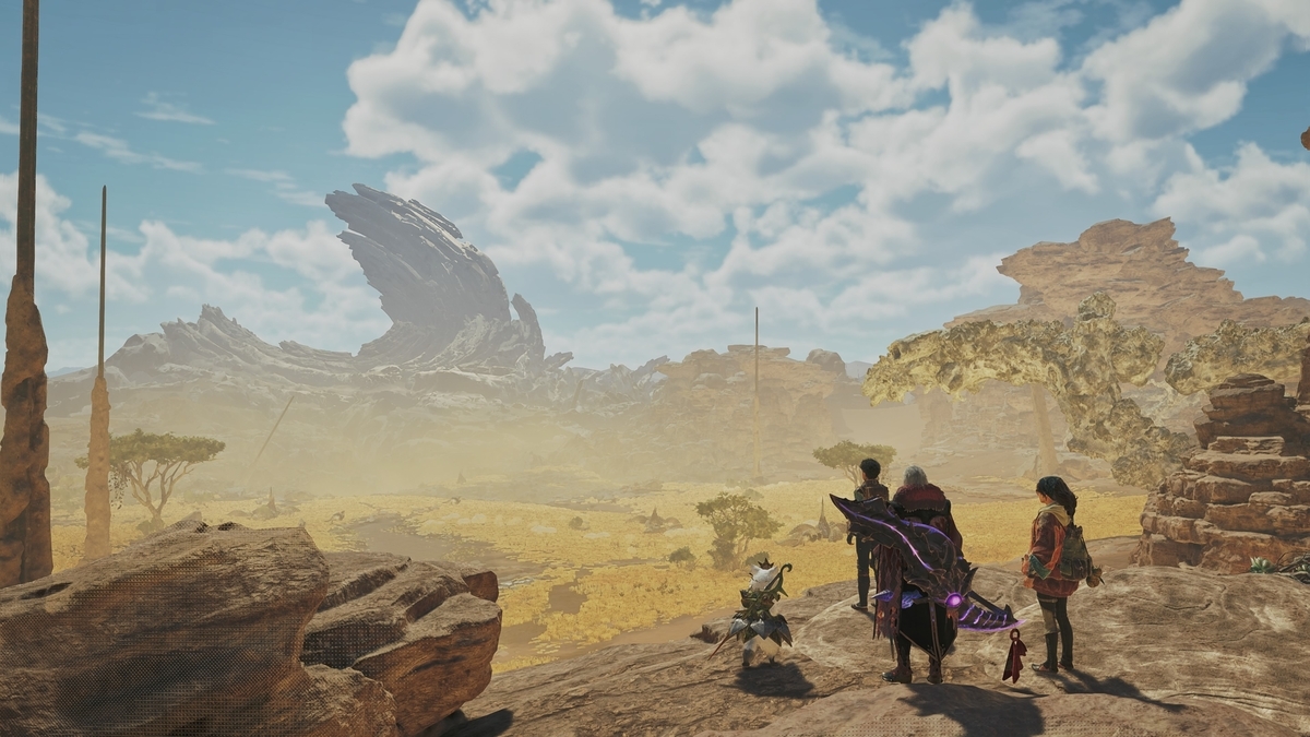 モンハンワイルズでは人々が暮らす拠点や村・里もフィールド内にシームレスにアクセスできるように配置されているほか、シリーズ同様に存在する砂原や密林地帯などの複数エリアのフィールドも地続きなっている。