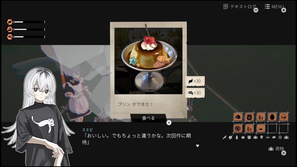 空腹を解消するためには道中で見つけた食材を利用して料理を作る必要があるが、料理に使用した食材の組み合わせで料理も変化するため、様々な料理を作成してスミビとニコミの色々なリアクションを確認していくのも楽しみになるだろう。
