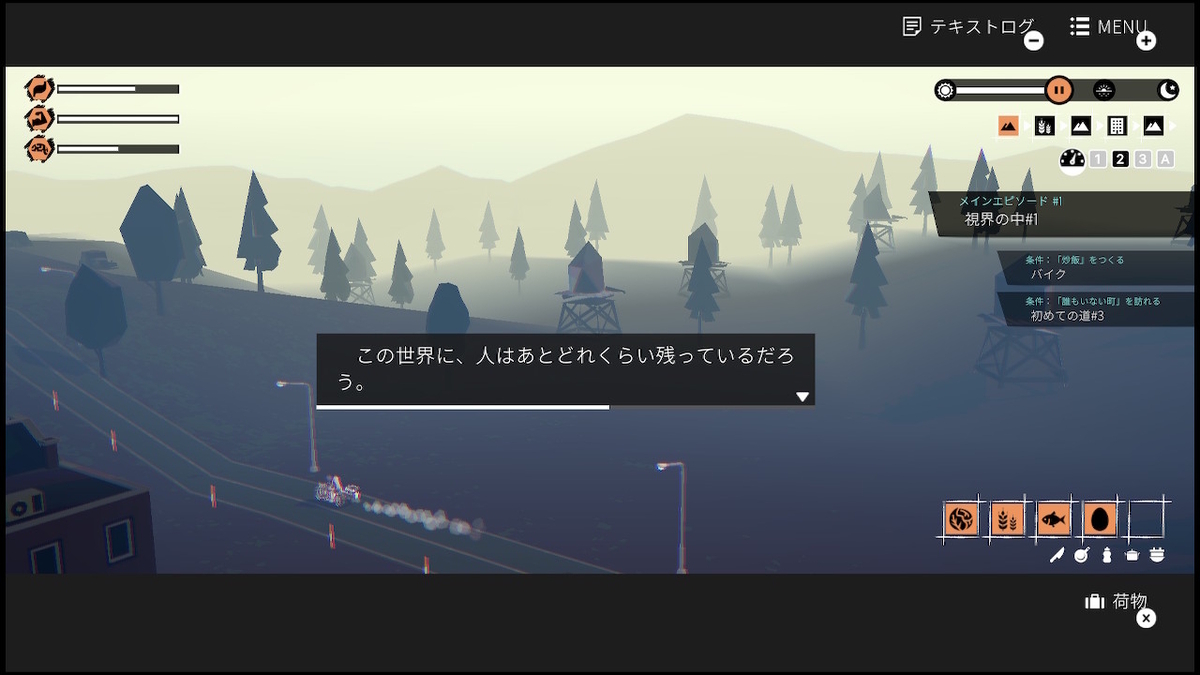本作のゲームプレイは移動しながら食材や寝床を探していく事になるが、あくまでも世界観と物語を表現するようなものでありゲームとして難しいスキルが要求されるものではない事は予め伝えておきたい。