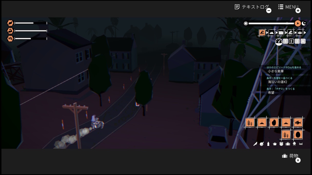 また、道中では寝床を探す必要も出てくるが寝床に到達できずに真夜中になってしまうとゲームオーバーとなってしまう。